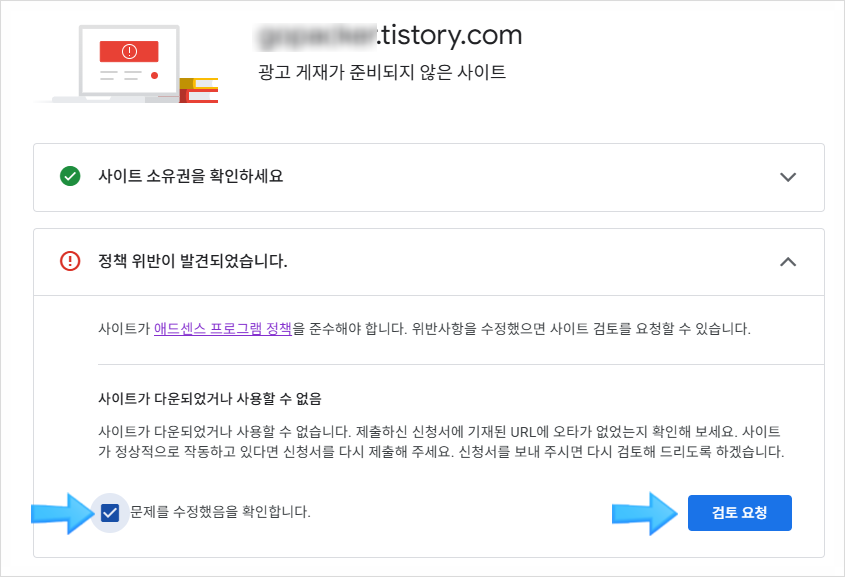 5. 저장 후 애드센스에서 “문제를 수정했음을 확인합니다” 클릭