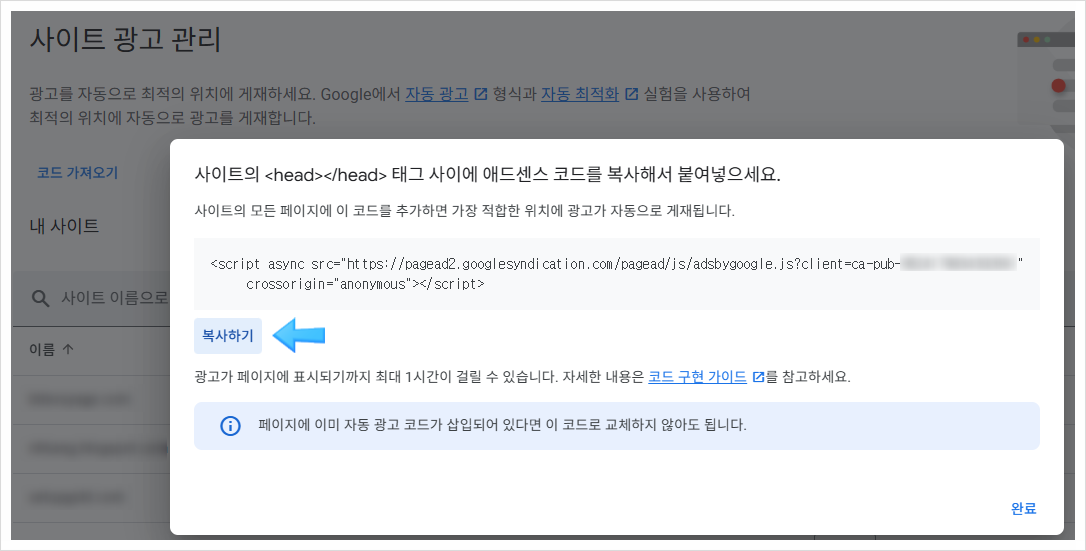 1. 애드센스 로그인 → 광고 > 코드 가져오기